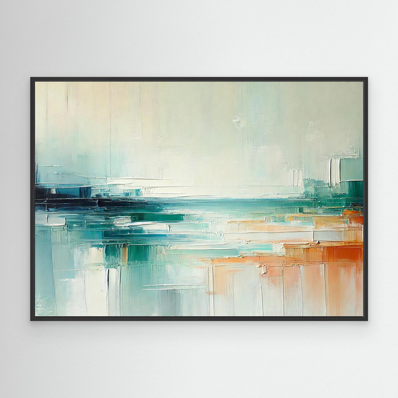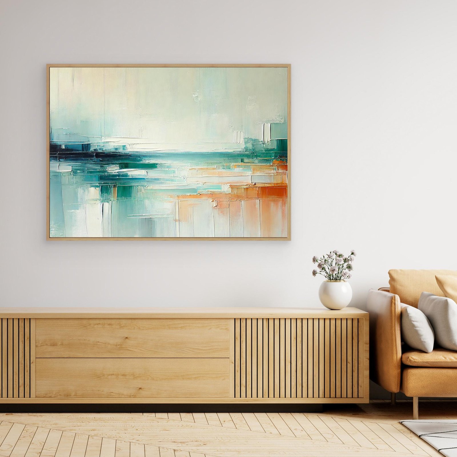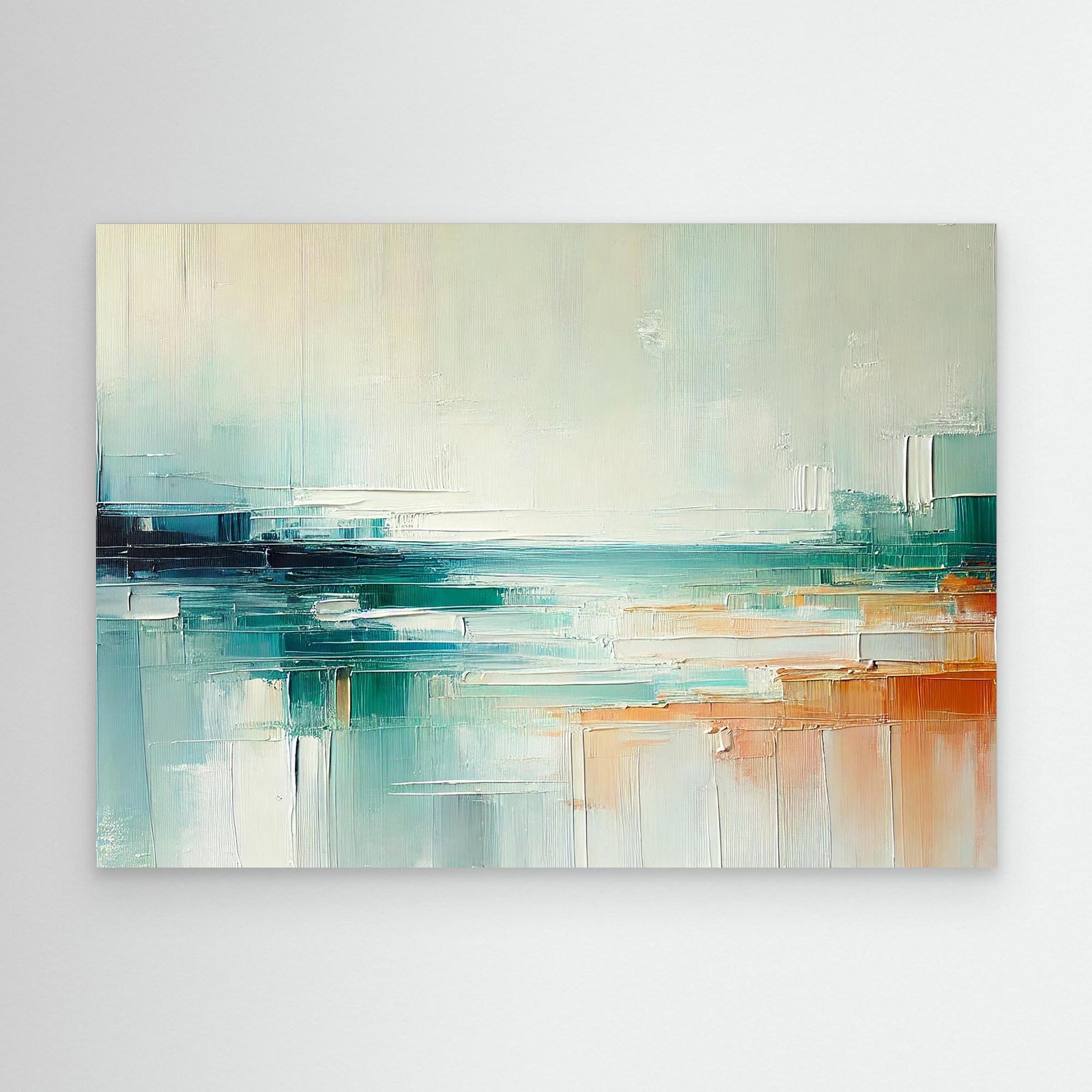 This modern abstract artwork presents a serene landscape, where textured layers of color blend harmoniously. Soft hues of teal and orange create a tranquil atmosphere, inviting contemplation. The interplay of light and shadow adds depth, while the smooth transitions evoke a sense of calm. This piece is an ideal addition to any space, enhancing the ambiance with its contemporary elegance.