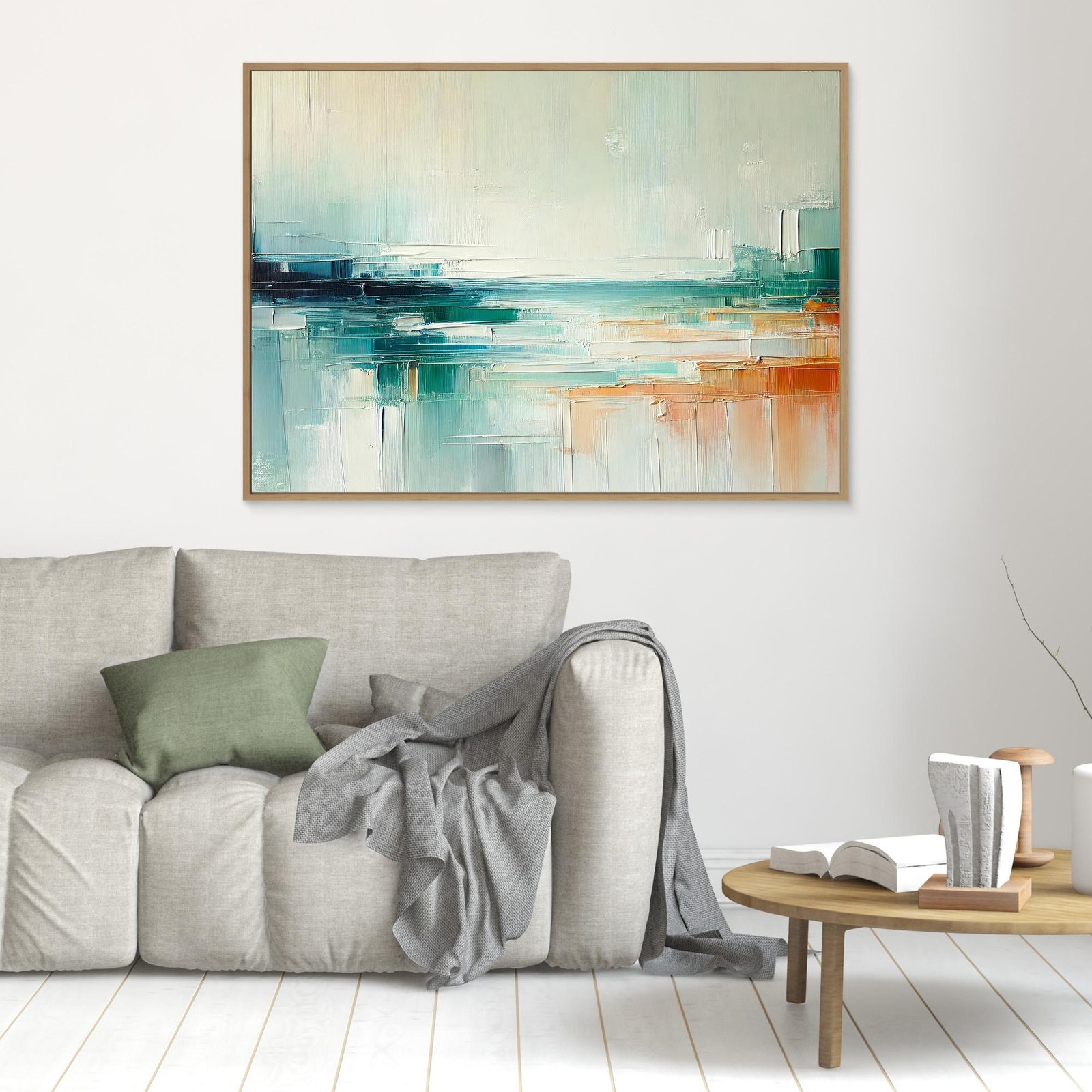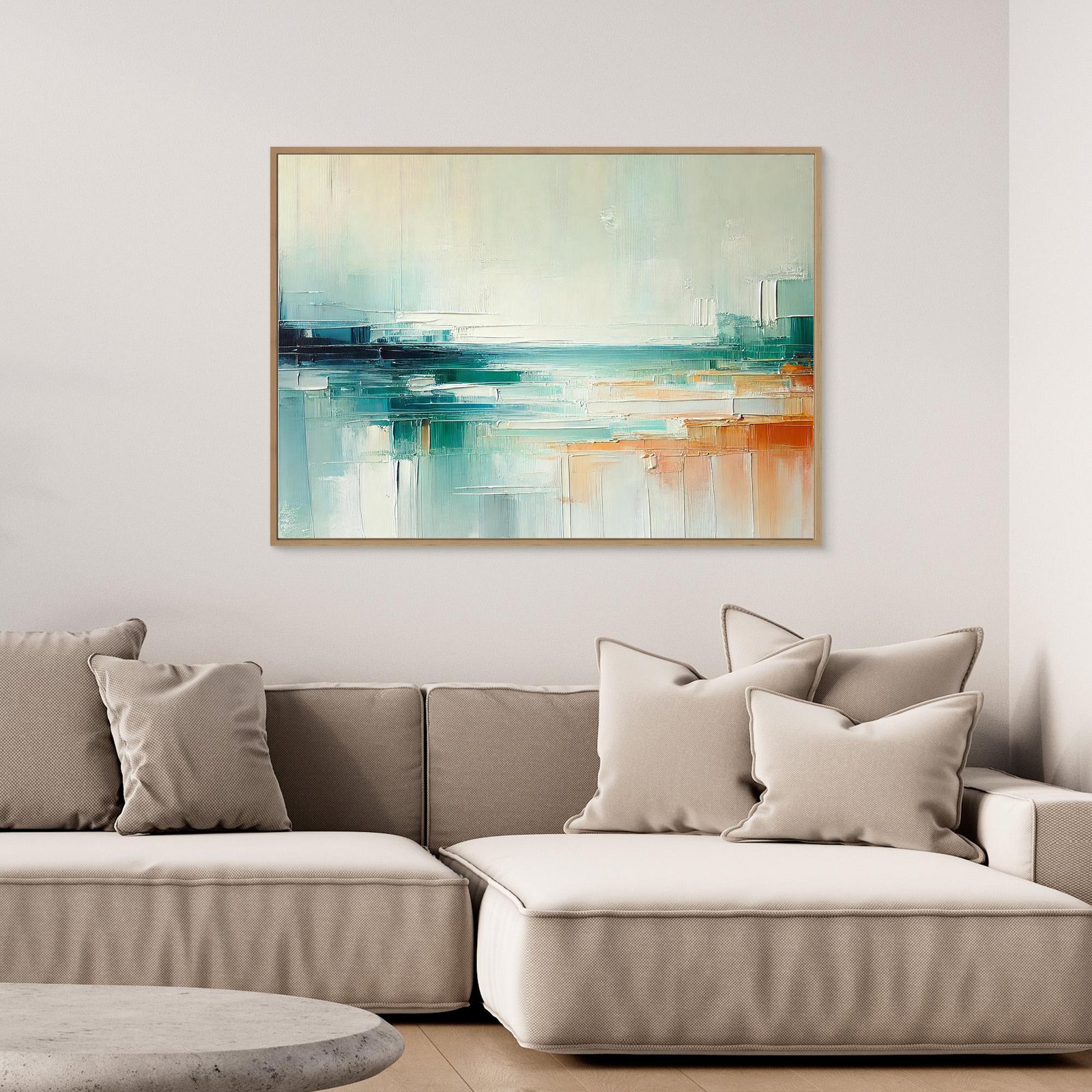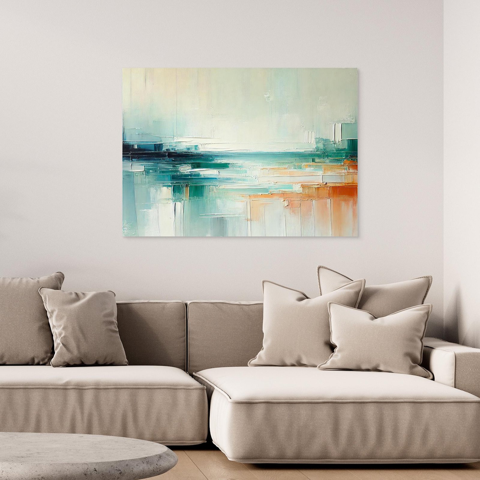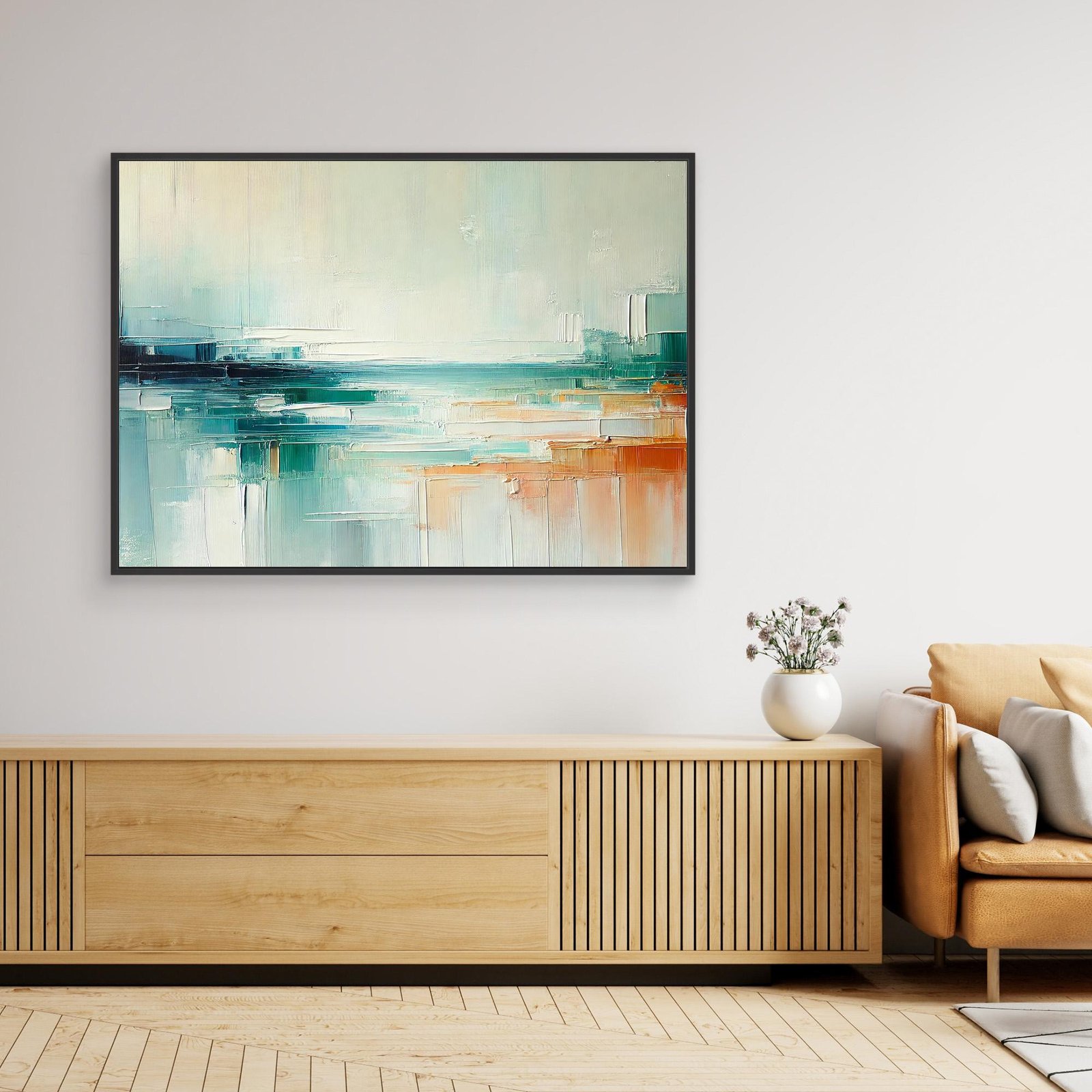 This modern abstract artwork presents a serene landscape, where textured layers of color blend harmoniously. Soft hues of teal and orange create a tranquil atmosphere, inviting contemplation. The interplay of light and shadow adds depth, while the smooth transitions evoke a sense of calm. This piece is an ideal addition to any space, enhancing the ambiance with its contemporary elegance.