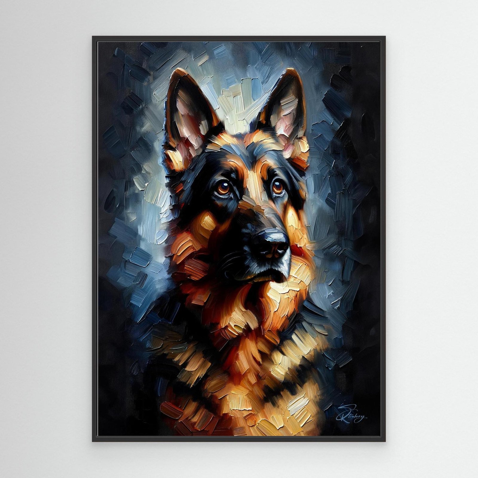 Guardian Eyes is a striking oil-style canvas print portraying the noble German Shepherd. Created with bold palette knife strokes and rich texture, this artwork captures the breed’s loyal and watchful spirit. The dramatic contrast of warm golden fur against a deep, moody background adds depth and intensity, making it a powerful statement piece.