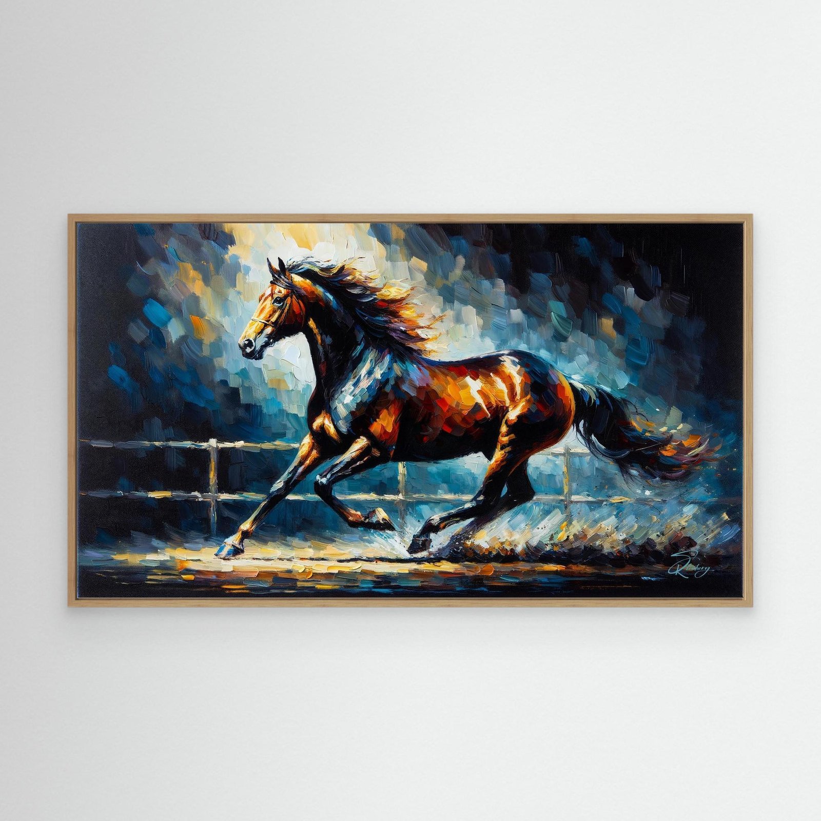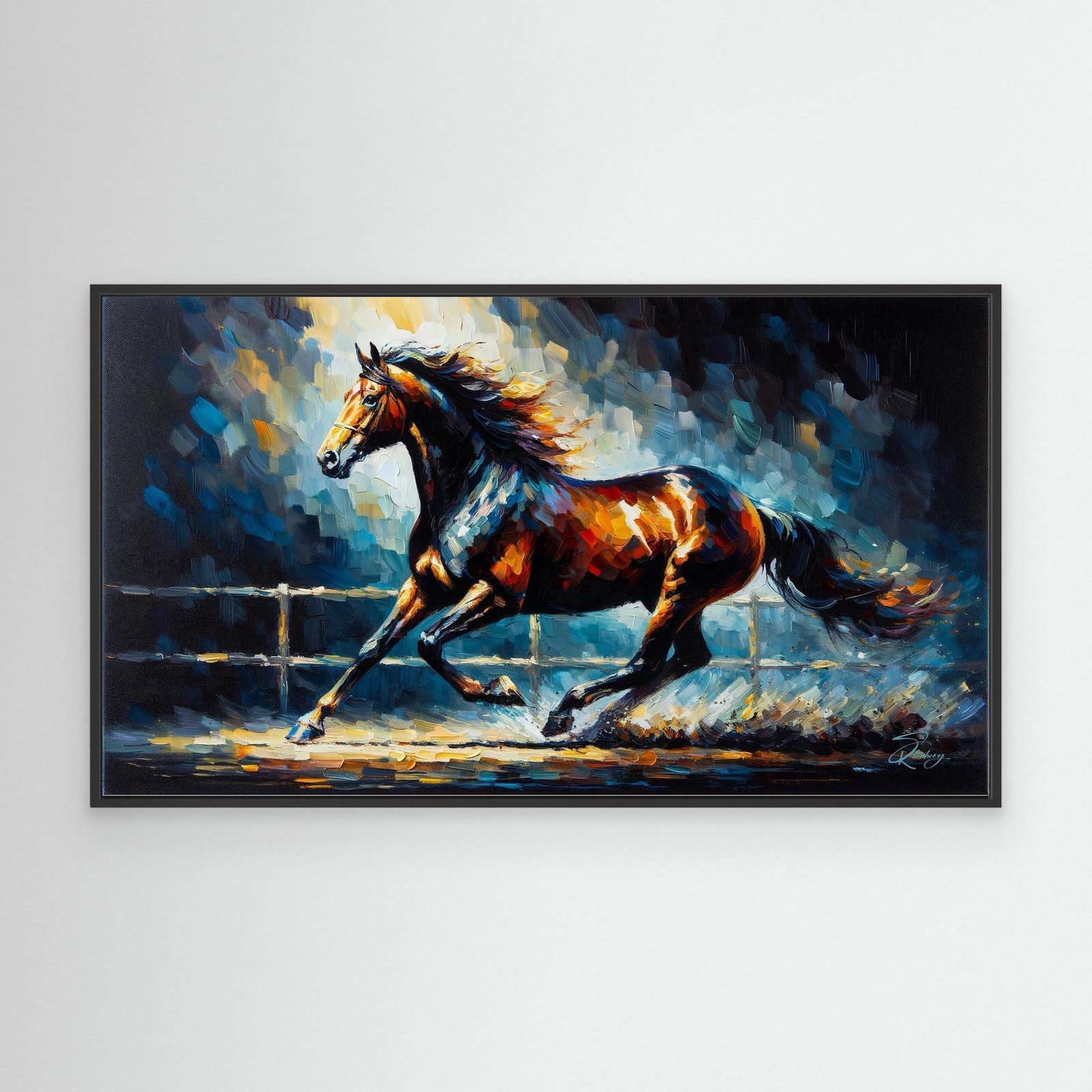 The dynamic play of light and shadow in fiery reds, golden highlights, and deep blues adds drama and intensity, making it a true statement piece for any space. Perfect for equestrian enthusiasts, modern art collectors, or anyone looking to add a touch of vitality and sophistication to their interior décor.