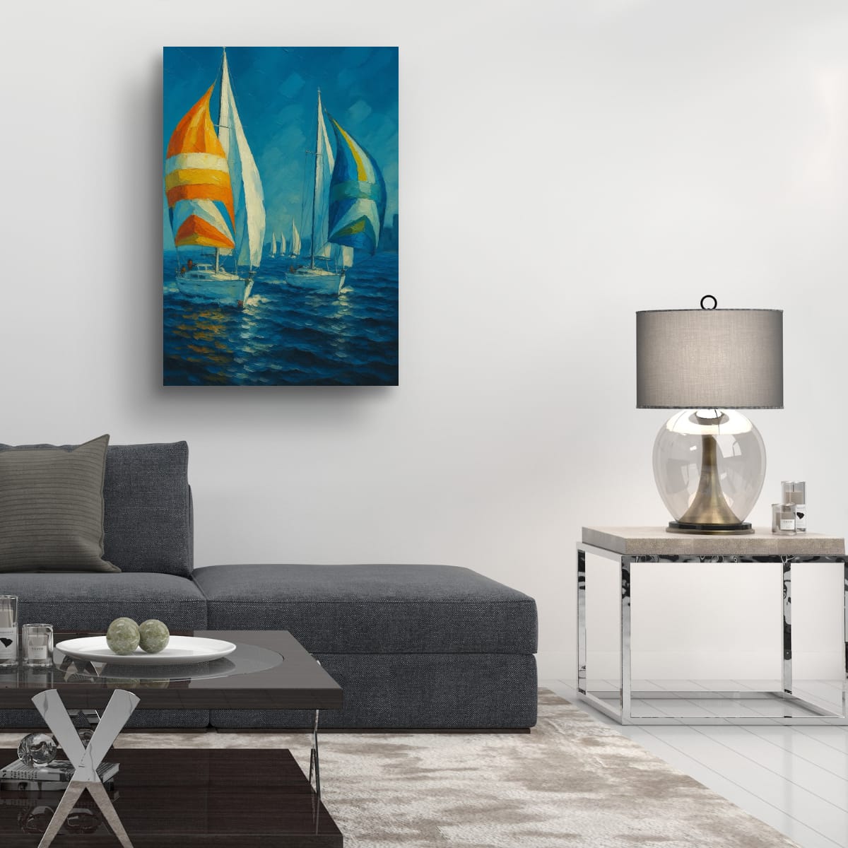 Add a burst of energy and movement to your space with Colorful Regatta at Sea. This dynamic canvas print captures sailboats racing across deep blue waters, their vibrant spinnakers in bold orange, yellow, and blue catching the wind. A striking piece for nautical lovers, this artwork brings color, rhythm, and the spirit of adventure into your home.