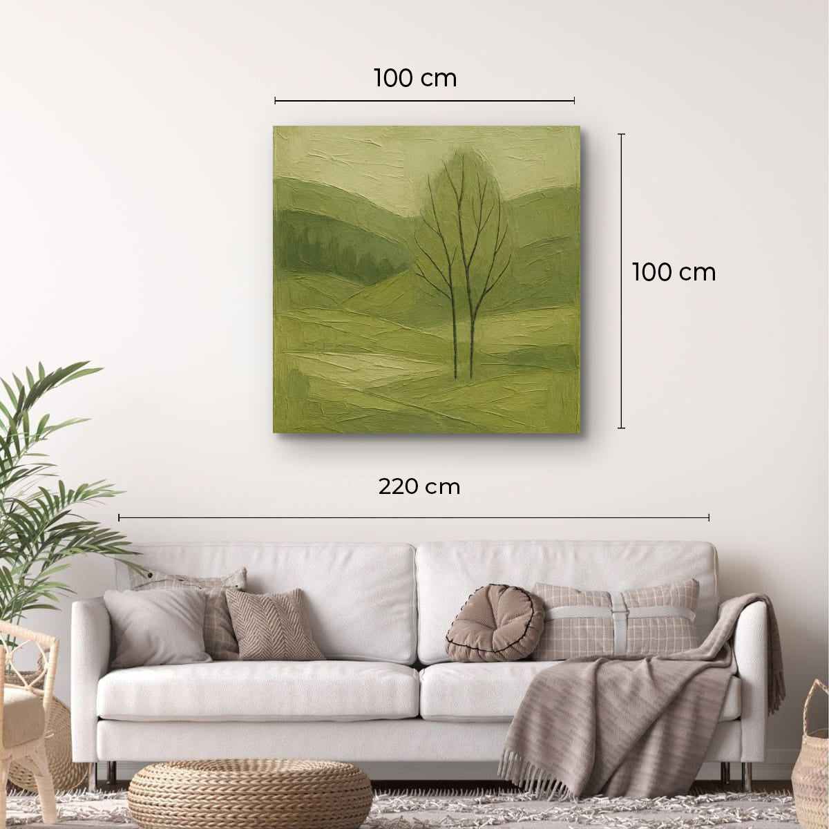 Silent Harmony is a serene abstract landscape painting on canvas, created with delicate brushwork and subtle palette knife textures. A pair of slender trees stands against rolling green hills, their simplicity evoking balance and quiet strength. The monochromatic green tones bring a calming, natural presence, making this artwork ideal for modern, minimalist, and Scandinavian-inspired interiors.